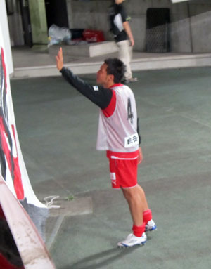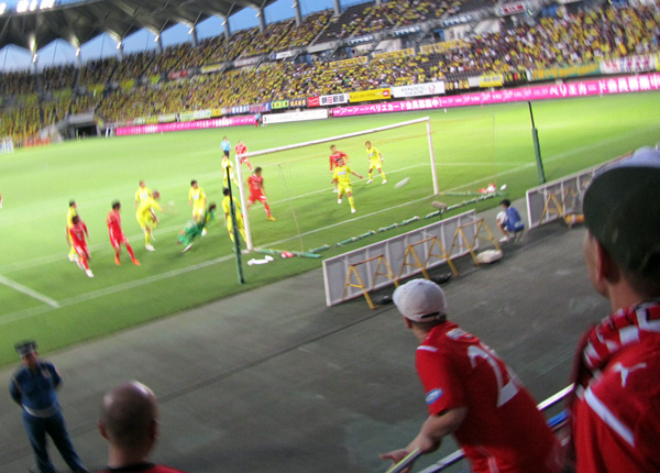 まあすぐにあっちのゴールにも入っちゃったんですけどね。真向かいだったんで遠近感がなく、何で黄色い人があんなにどフリーだったのか一瞬わからんかったけど、これまた録画見たら納得。というかあれは全速力で詰めないとダメでしょー赤馬DF陣。