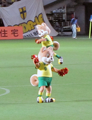 ロアッソのゴール裏応援団は試合中はコワモテにみえるけど、皆さん各チームのマスコットが大好きというラブリーな方ばかり。だからワンコが踊るHTは憩いのひととき。
