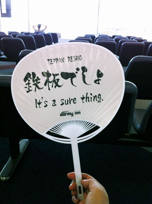 よっしゃ!と心に誓いながら宿泊先のホテルでもらった団扇を取り出したらこんなコピーが。