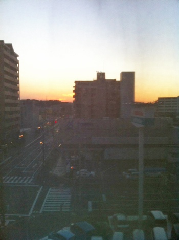 試合から一夜明けてホテルの窓からの朝焼け。
