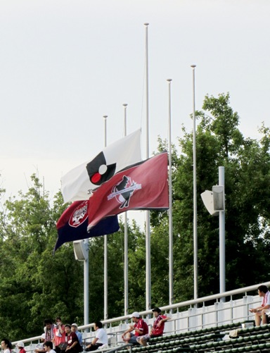 半旗のJリーグ&両チームフラッグがはためく中、試合の時刻がきたんです。