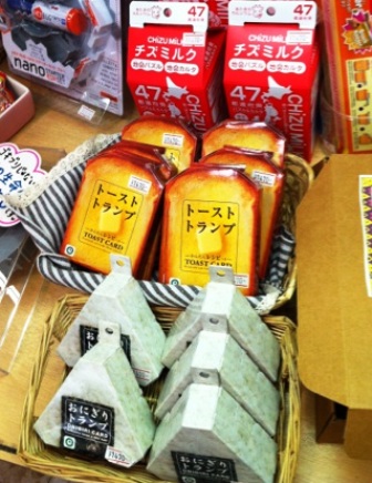 ボーディングブリッジに行く途中のお土産ショップにて。おにぎりトランプの取説はたくあんだった。