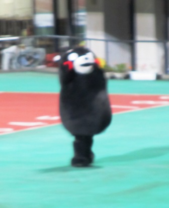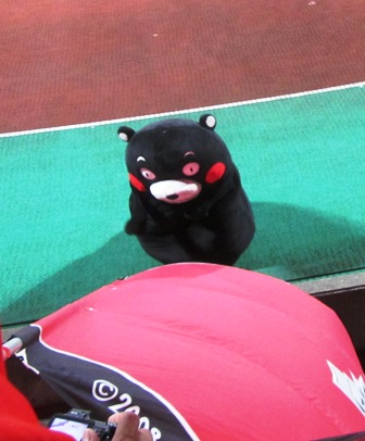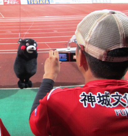 ピッチにいるくまモンと何やらじゃんけんポン。今日の小芝居は細かすぎて伝わらないモノマネ選手権みたいなノリ。