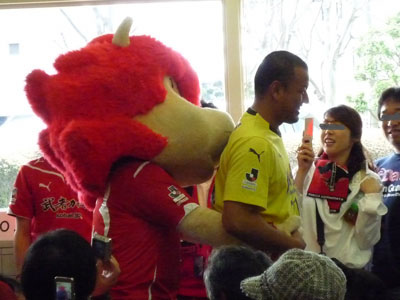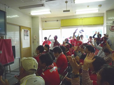 勝利を喜びつつ帰途につくサポーターと一人一人握手でお見送りしてくれたDJコバさん。オバチャンも、力強いその握力にいつも元気をもらってます。ああ幸せー♪