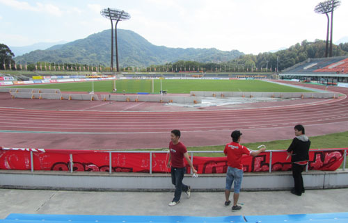 選手到着を見届けてお席の方へ移動しました。ゴール裏からの眺め。
