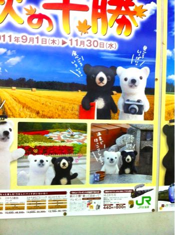 新千歳空港駅で遭遇。十勝のくまモンは白黒コンビ。