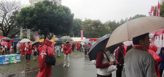 少し時間が経つと雨のスタグル広場にも紫の装いの京都サポさんの姿が見えました。