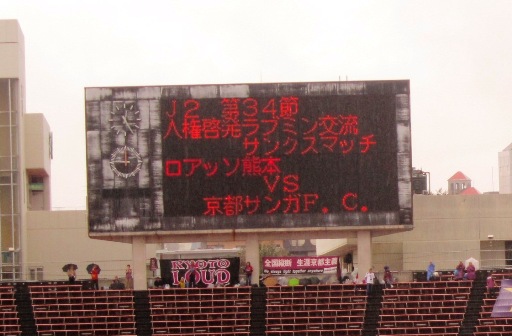 本日のお相手。ようこそ水前寺へ。アウェー側に紫の集団が陣取るのは初めてです。