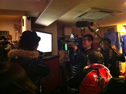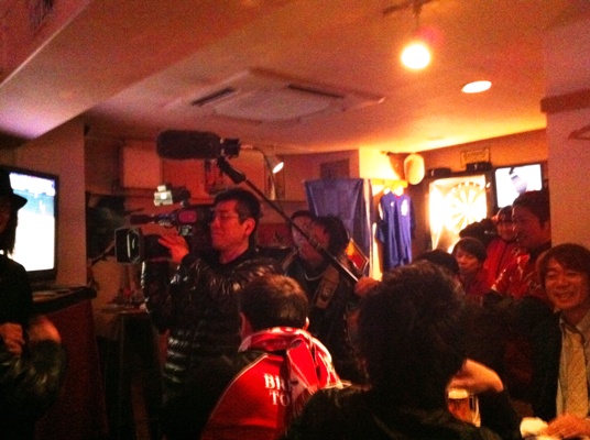 ただでさえシーズン前でサッカーやロアッソに飢えている濃いめサポがみっちみちに集まった空間に、全国のJリーグチームサポにとってスカパーにおけるJリーグの象徴みたいな御仁が足を踏み入れたら、そらもうサル山に大好物の果物放り込んだようなもん。