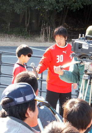 いろいろ話してたら、選手が控えてるテントから突然ハヤトくんがやってきてコバさんに向かって「巻きポーズ」。場内が一気に和みましたよね(^^)