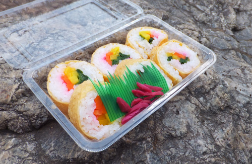 人吉・球磨の物産ブースで確保したお漬け物を巻いた巻き寿司。海苔の代わりに薄焼き卵でポップな色合い(^_^)v