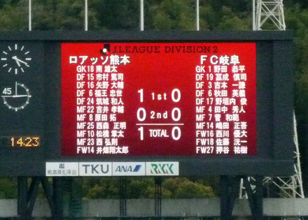 あとで名前を知った岐阜のハシモト選手が「上手いな。小面憎いな」という印象で、真ん中あたりの打ち合い取りあいがとにかくスリリングだったように思います。ロアッソサポとしては「3つめまで持てないなー」という感じ。