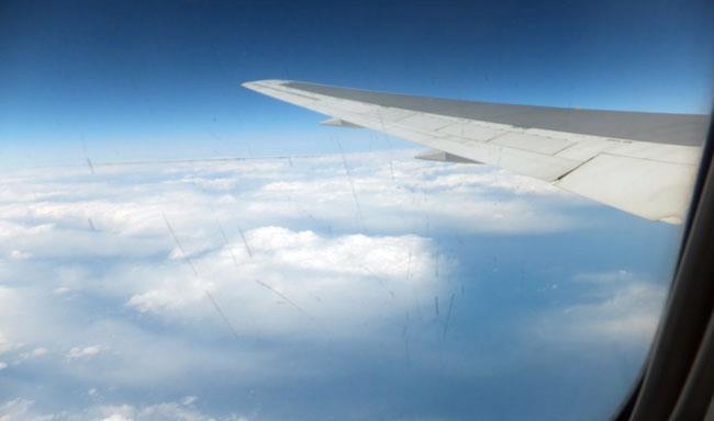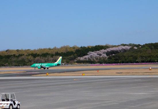 グリーンのSDA機が飛び立つ向こうに桜が咲いていました。