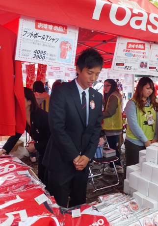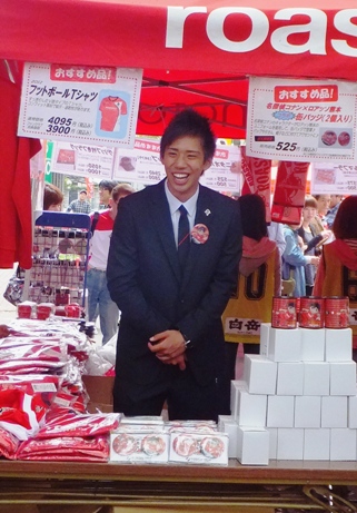 ロアッソコナンくんのバッジを付けてレプユニお渡し役がイチくん本日のお仕事です。