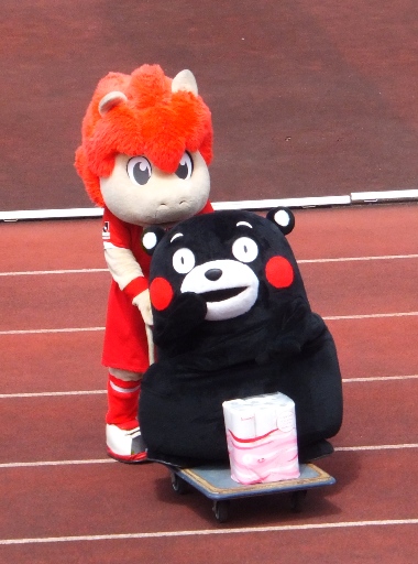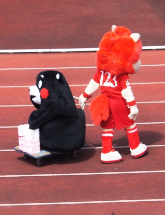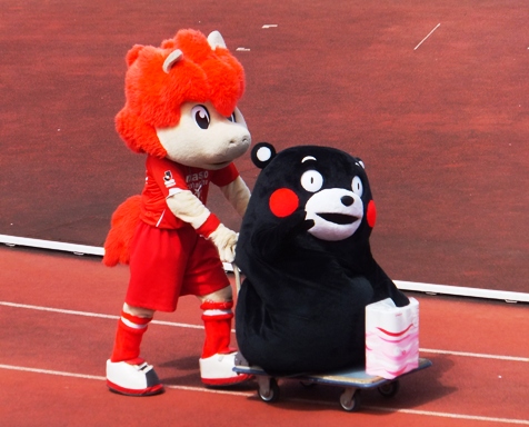ロアッソくんがくまモンの前に立って目隠ししたり、乗ったままの台車を後ろ向きにほったらかすゆる〜い小芝居。