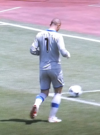 そこそこ攻めていた時間帯。誰と衝突したわけでもないところで守護神にして最大の防御壁であるミナミくんに突発事故発生。彼の仕草を見るとどうやら股関節あたりを傷めた模様(-_-;)。