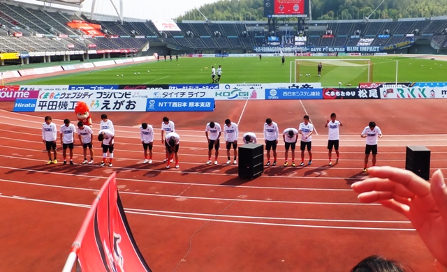 ロアッソの選手も戦闘態勢でピッチに散り始め、試合直前の張り詰めた雰囲気の中、そこだけホンワカ状態。