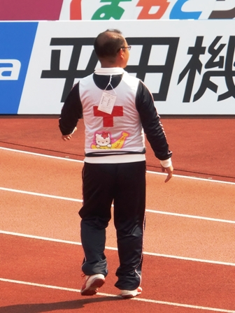 担架係の赤十字ビブスにはバナナ&キティちゃん。
