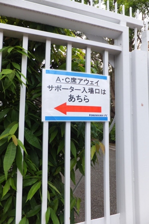 降りたらいきなり三ツ沢アウェーの洗礼。スタジアムの外周を歩いてアウェー側へ行けとのことで、案内人もいない住宅横の道を10分近く歩いてようやくこの張り紙(-_-)。
