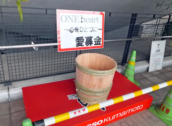 これがウワサの樽募金。数年前に他チームが試合日にやっていたそうだけど、ウチだってがんばらなくっちゃ。