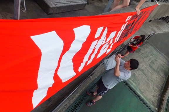 つい数日前の水害に対する横断幕とロアッソ熊本コールをいただきました。