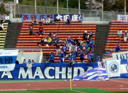 両ゴール裏が芝生で立ち入りできないのかもしれませんが、バクスタのど真ん中に陣取っての応援です。少ないながらも色々なコールを響かせていました。……でもちょっと音程とリズムがばらけてたかな(^^;)。