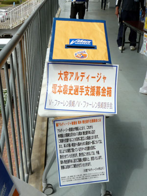 例の大宮アルディージャの塚本選手への募金をJFLの試合でもやっていました。カテゴリ越えはJ1J2だけじゃないんですね。なんか感動したのでプチ募金してきました。