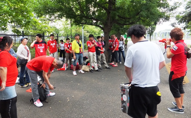 まず元柏組のコールを練習です。ロアッソは全員違うコールで選手を鼓舞します。