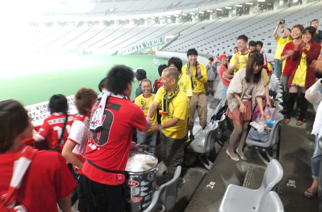 まったく知らない同士。どころか、2010年にはリーグ戦で戦った敵チームサポ同士。しかもあちらは百戦錬磨でJリーグサポーターの王道をいく柏レイソルサポの皆さんです。