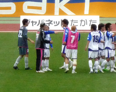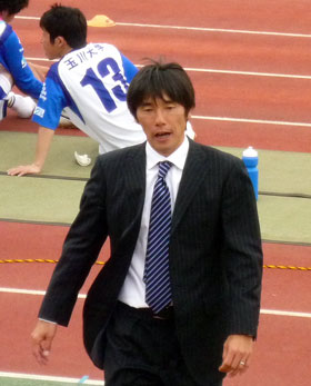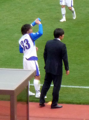 試合は町田の勝利でしたが、喜ぶよりも先にコーチに何やら進言中。