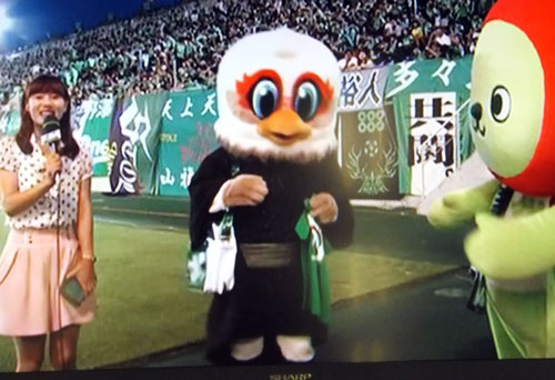左側の面妖なキャラが山雅のマスコット「ガンズくん」だそうです。