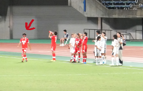 向こうからこっちに向かってのゴールだったので、選手が団子になってて抜け出したボールがミナミくんの足の間からネットに転がってきた印象。