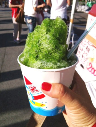 今回唯一画像に収めたのは芦北咖喱街道ショップのかき氷宇治茶味。西日の強いスタグルメ広場ではみるみるうちに山が崩れてきました。が、溶けても美味しうございました♪