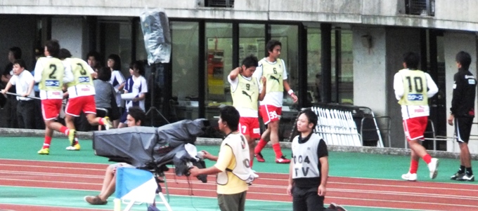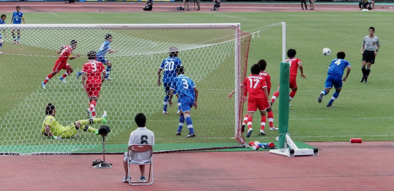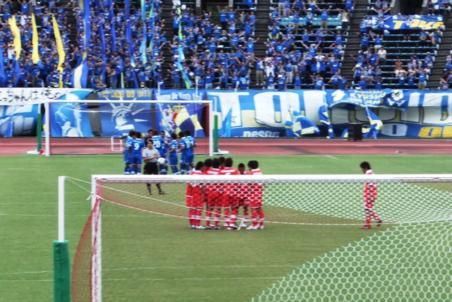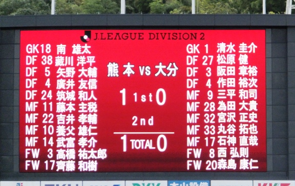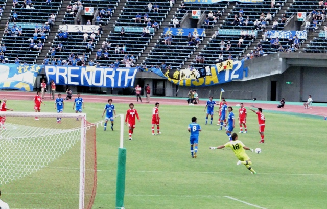 前半は大分が風上から攻撃。軽く蹴っても風で加速して伸びすぎたり、手前に落とそうとするのがゴールまで行ったり。