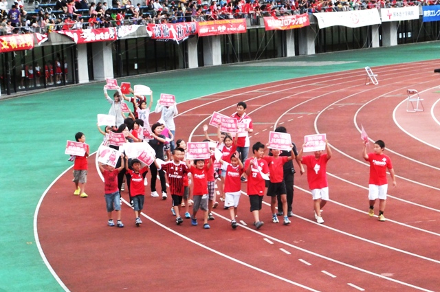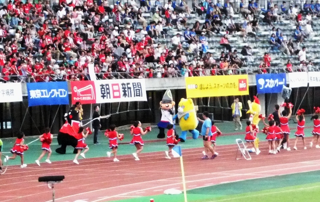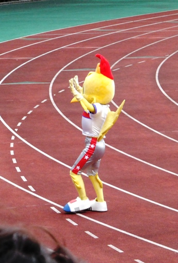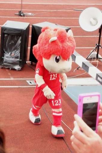 駆けっこ終えてマスコット軍団がゴール裏に来た頃にはもうHT終わりかけ。選手が出て来始めたのでコールを始めると、ゆるキャラの皆さんもふつうに飛んだり腕振り上げたりで様になっててびっくりです。