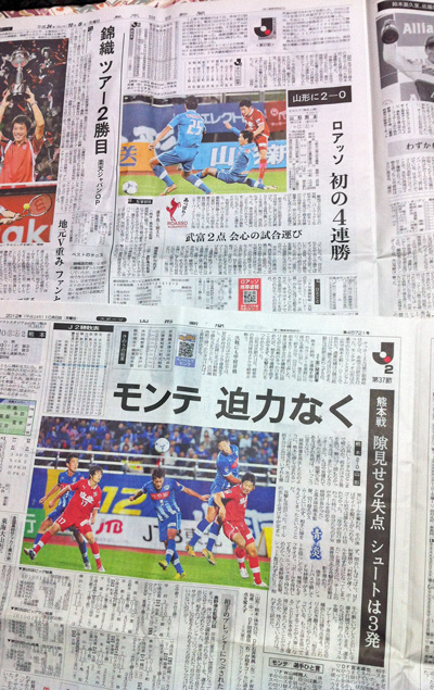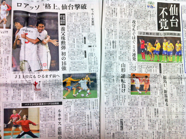 ベガルタ仙台×ロアッソ熊本の試合翌日(つまり本日)の熊日新聞と河北新報。