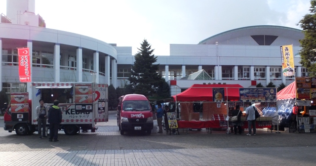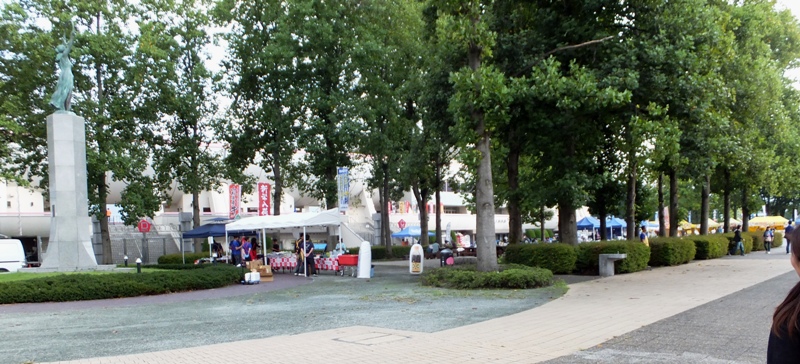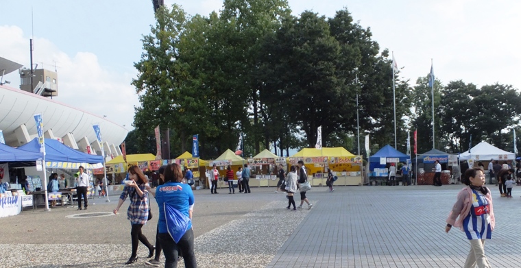 シャトルバスから降りるとメインスタの正面に進むことになるので、NDスタで最初に目に入るのは居並ぶスタグルメの数々です。良い匂いも漂ってきます。