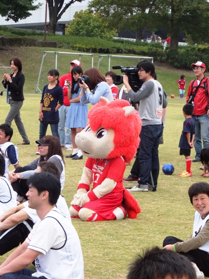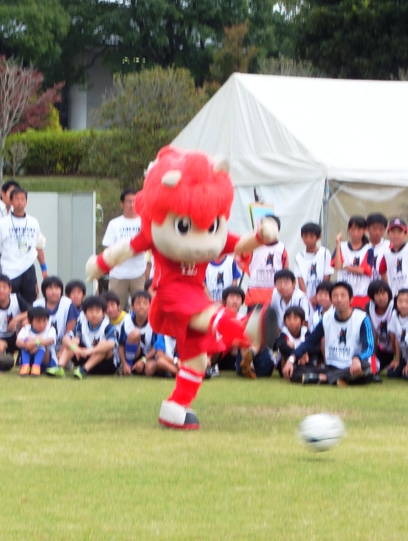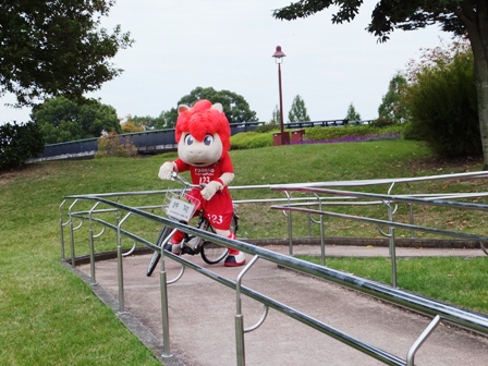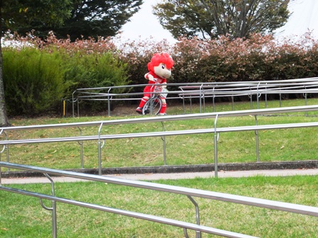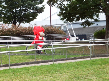 直後になぜかチャリを飛ばしてきたロアッソくん。スロープのヘアピンカーブをものともせずイベント広場にまっしぐら。