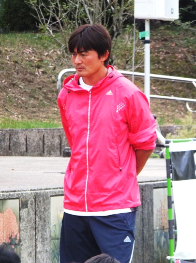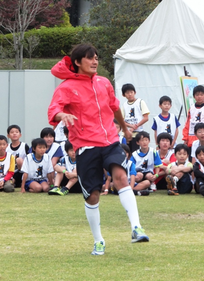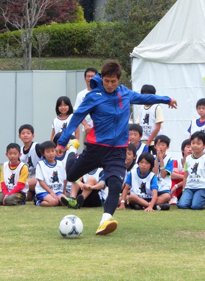 要するに。腕の振りは足で蹴るボールのスピードに関係があるという実技でのり巻きシュートを放つ福西崇史さん。