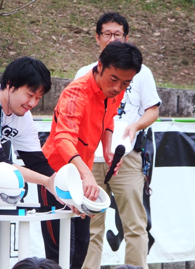向かって一番左の方がサッカーをサイエンスで教えて下さる先生です。ここであだっちーも参加♪ 先生お隣。役得ですね(笑)。