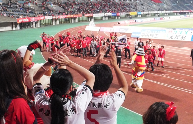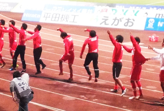 勝ったら選手はピッチ内で待機。最近はここに飲み物や着替えが運ばれてきます。チームの方もすっかりカモンロッソコースができあがってるのが楽しい。