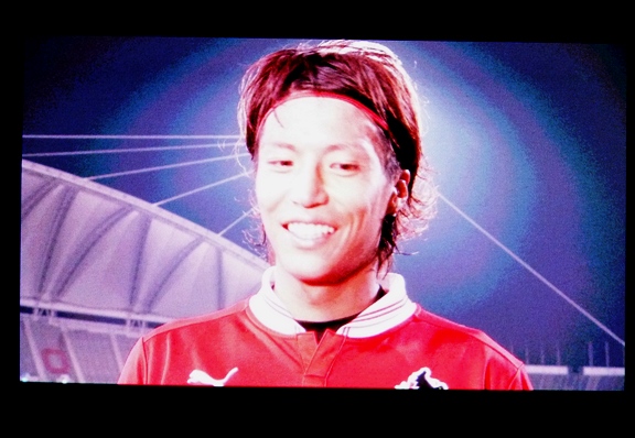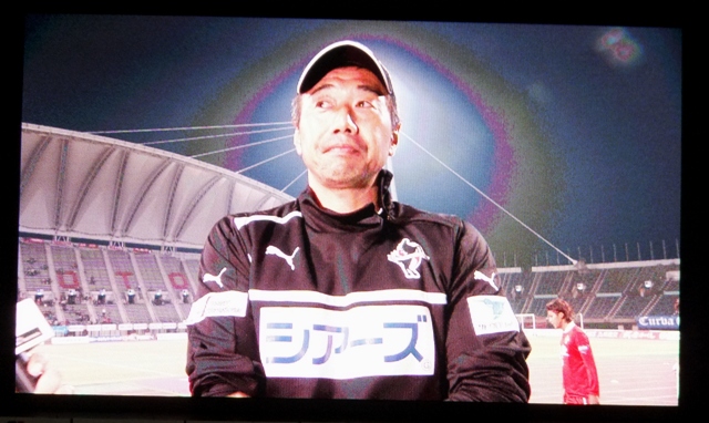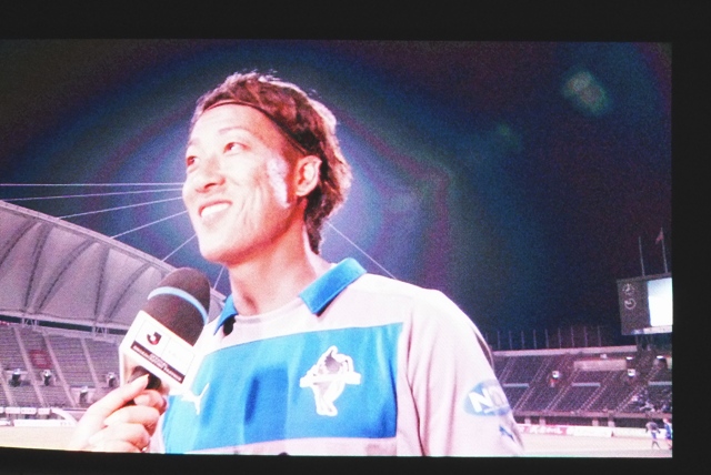 勝利インタビュー3連発。大画面を写したら3人とも後光が射してた(笑)