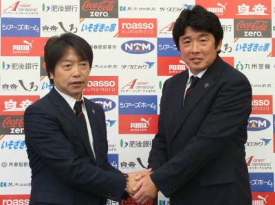 「私はU-19の監督をやっていまして、その候補の選手が熊本にいましたので何回か来て、ロアッソの試合も何試合か見せていただいて、非常に素晴らしいチームだなと。本当に一生懸命、90分間戦う姿勢を持ち続けるということで、僕自身はいい印象をもっていました。サポーターの方も熱心に応援してくれて、本当にチームとして一体感があるし、県としてもロアッソを応援しようという姿勢がある。こういうところは素晴らしいなという印象はずっと持っていたんですね。それで私の方からアプローチして、ぜひここでやらせてもらえないかということでお話をしました。それで引き受けていただいて私としては本当に感謝していますので、その恩に報いるように、いいチームを作っていきたいと思っています」