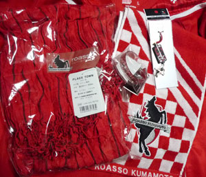 オサレーなショールがお気に入り。コンサドーレグッズかと思うようなデザインには食指動かなかったけどロアッソらしいタオマフ発見。アウェー応援のデコレート用に普段絶対付けないバングルも買いました(^^;)。「蹴」の文字が頼もしいストラップはお守り代わりに。