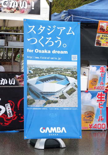 入場前に並んだのは大阪名物たこ焼きの名店「くくる」の屋台。ガンバはこんなスタジアム作る構想が出てるんですね。