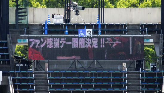 PUMAのマッチデーということでアウェーゴール裏上段に電光掲示板が設置されていました。一発目のお知らせが「ファン感開催決定」。6月2日、