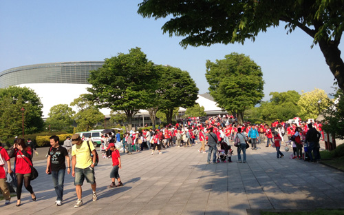一般入場待機列が緑の中で一直線に伸びて綺麗です。緑には赤だねえ。