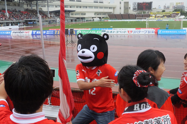 近頃は、試合前に出てきてくまもん隊のお兄さんがゴール裏のサポに向かってハッパかけてくれるといういつもの光景。
