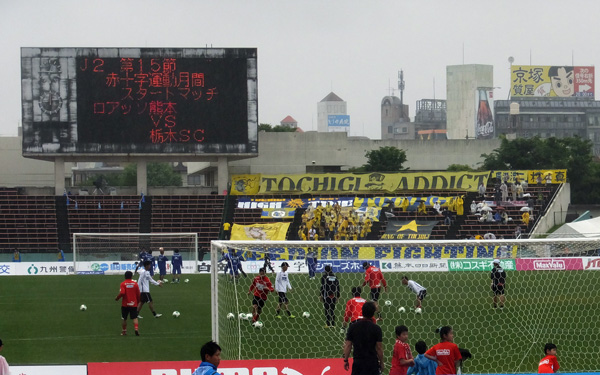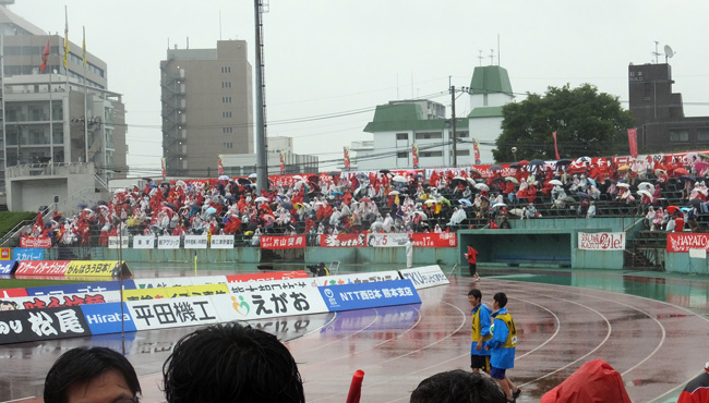 こちら熊本側。雨だし水前寺だしの予想通り。観客数は3381名とのこと。それにしては入ってるように見えるのが水前寺マジック。