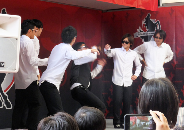 足の怪我はどうした!と見物人全員が突っ込みたくてウズウズしたゴリョーモンのアクションくまモン体操(左)